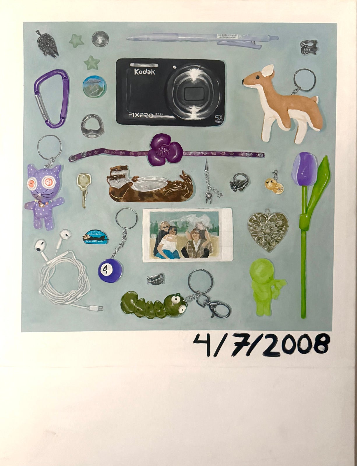 This painting explores the significance of ephemera and the way temporary objects can carry lasting emotional meaning. Inspired by the modernized quote "I am a mosaic of everyone I've loved," the piece is based on a photograph I previously created as a self-portrait made entirely through objects rather than my physical likeness. Each object depicted in the painting was either a gift from a loved one or collected during a meaningful moment shared with one. Although the objects themselves may be temporary, they represent memories and relationships that continue to shape who I am.