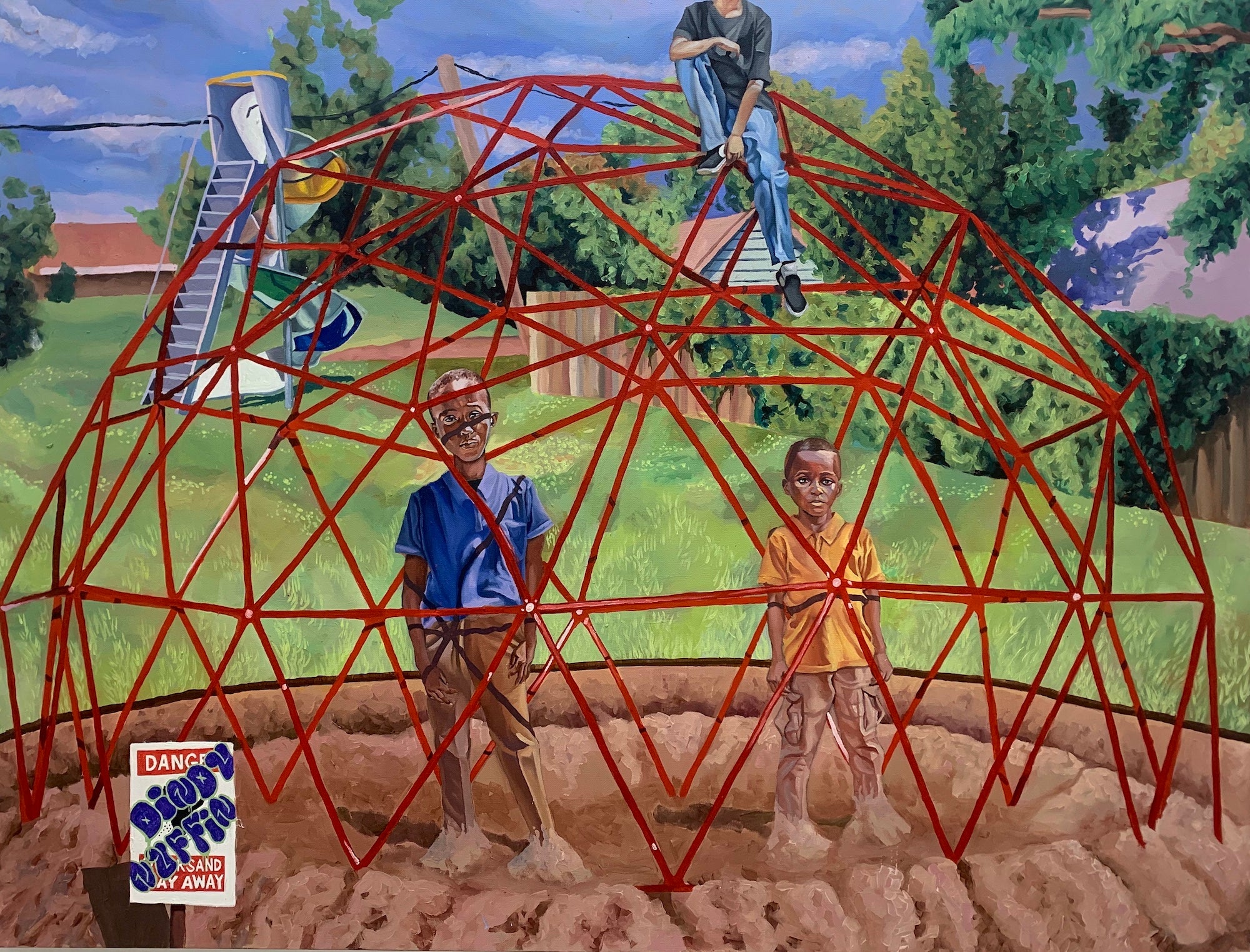 Through painting, I am exploring the interrelationship of ideological systems, history, representation, and Black experience. I believe in the importance of creating artwork that reflects on the state of society. I see my artwork as a form of activism, as well as a driving force for uncomfortable but necessary conversations. The current polarity of society is due to a lack of exposure, a lack of knowledge, and an inability to connect or understand each other. My main focus is making Blackness visible, in an attempt to combat erasure and to place Black figures into the artistic landscape. By working in a representational manner, I can only offer a glimpse at the world through the eye of a millennial Black woman on the journey of self-discovery. “Cops and Robbers” is a part of a larger series titled A Generation Neglected. The series focuses on the issues inherited by Generation Z, forcing the audience to confront the environments we have constructed for our youth. This piece, “Cops and Robbers,” deals with the premature transition from perceived innocence to criminality in Black boys.