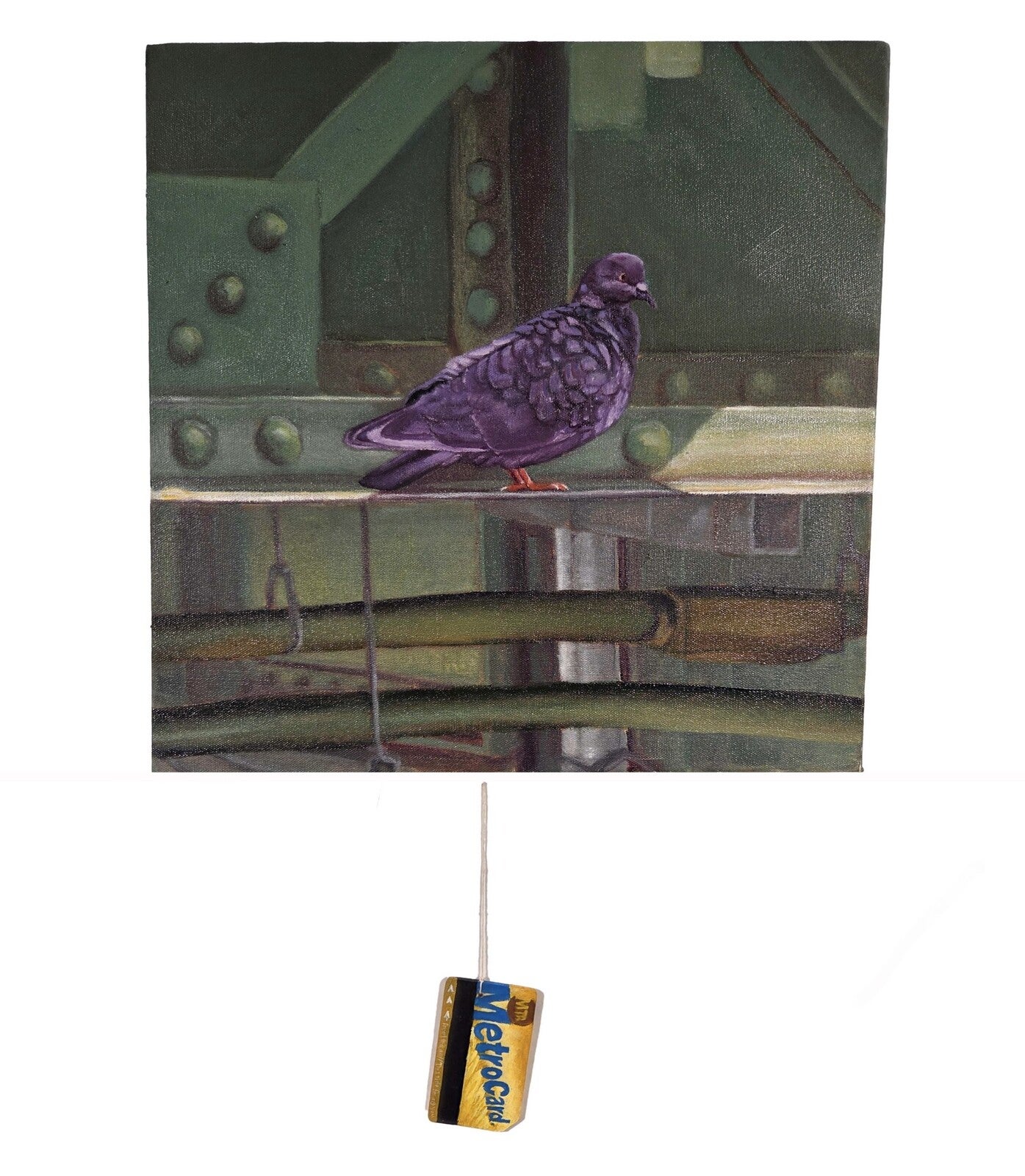 This oil painting was inspired by a trip to New York City and the ephemeral metro card. The pigeon is perched on the Manhattan Bridge bathed in warm light with a metro card in the "trompe l'oeil" technique hanging from a string off the painting. The contrast between the soft bird subject and the industrial materials highlight its fleeting nature. This piece offers a romantic repositioning of the default perspective people tend to have when viewing ordinary life and everyday experiences.