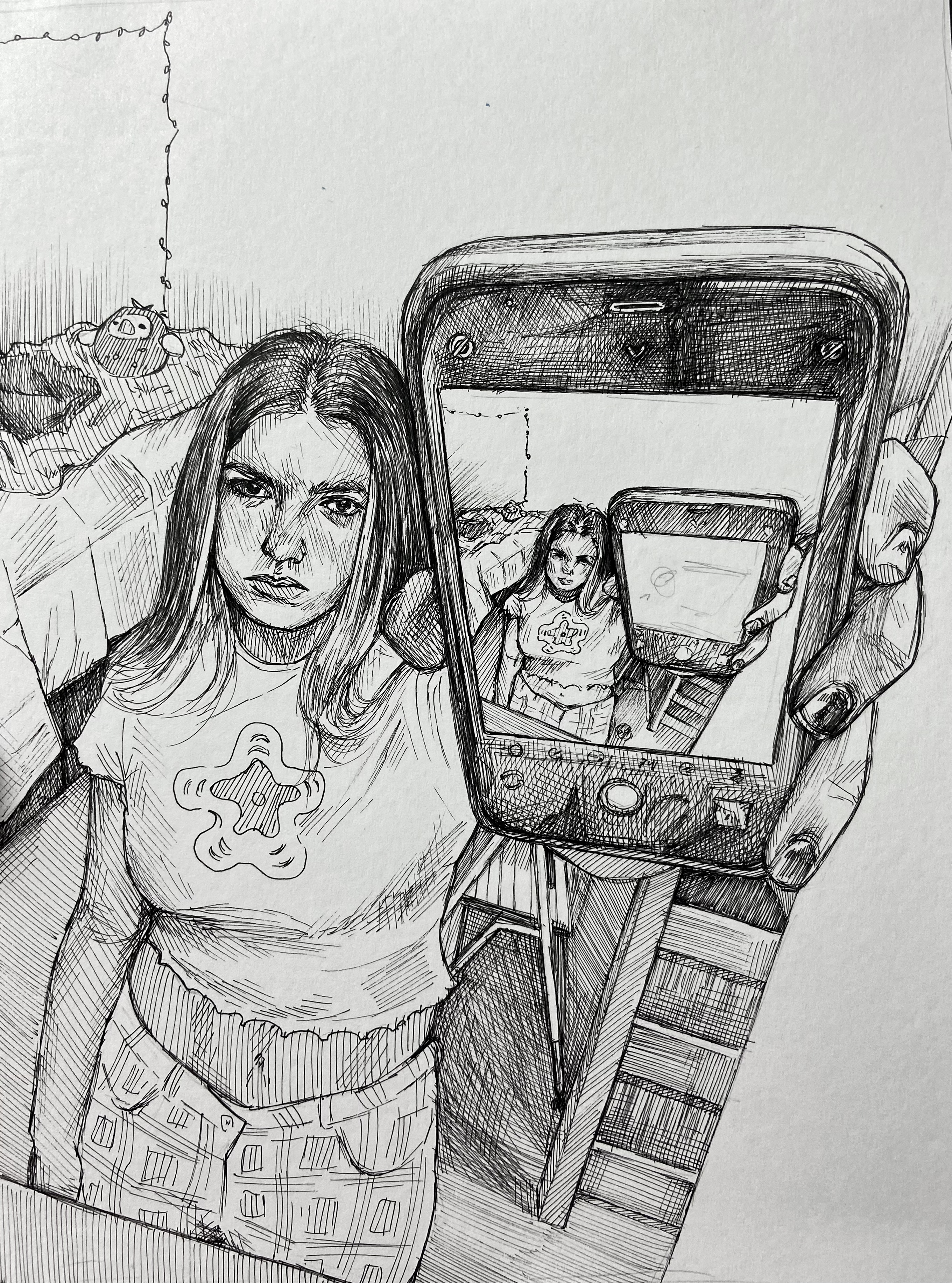 This piece, Out of Body, was experimental in terms of both the content and the medium used. It is done completely in micron pen. Though I have used micron pen before, I had never done a self-portrait with them, and not something as meticulously detailed as this piece. I wanted to create a believable environment that felt lived in, hence including the small details such as the lights hanging on the wall in the background and the stuffed animal sitting on my bed. This drawing was inspired by feelings of frustration and self-consciousness but was created and brought to life as a defiance to those feelings. Being that the piece is a self-portrait, making it felt like refusing to let that self-consciousness fester. The work acknowledges the relationship between technology and how we perceive our bodies, and additionally reflects on the feeling of disconnect you sometimes experience when you look at yourself in the mirror for too long and start to pick apart everything you see.