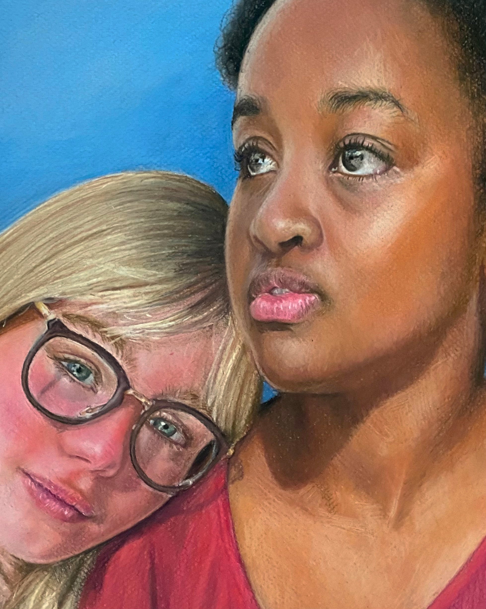 My closest relationships with friends and family are crucial to my understanding of my identity and my ability to feel connected to my surroundings. The simple gesture of resting my head on another person’s shoulder represents so much to me: from the comfort and closeness of this contact to the support and relief I find in friendship and emotional connections. In this pastel portrait, I wanted to explore seeking strength and support in interpersonal relationships through the depth that this simple, yet meaningful gesture can represent. I used warm, vibrant colors to emphasize the comfort of this connection, and paid special attention to the depth and vibrancy of the skin tones used, as I associate this with the personal closeness and trust I intended to depict in the piece. Through both subjects’ fixed, calm gazes, I sought to convey the mutual sense of peace and comfort that I experience through a friend’s support and understanding. Ultimately, this piece explores my perception that seemingly small gestures can hold immense emotional significance and serve as a means for strengthening meaningful connections with others, which I find essential in cultivating relationships that create a sense of purpose and meaning.