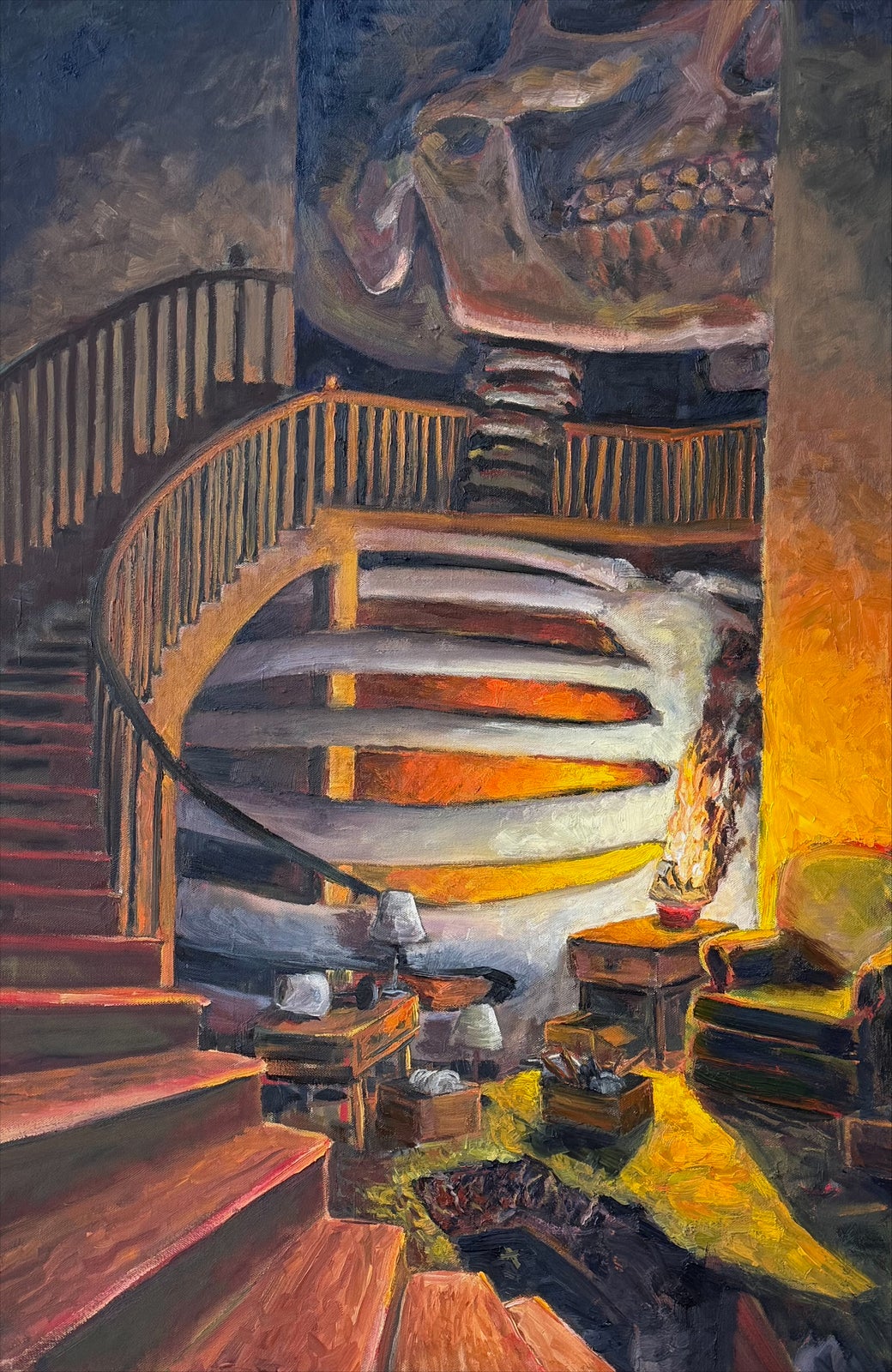 Inheritance was the first painting I worked on for the haunting series. I started this work over a year ago but only recently completed it. This painting is now the third I have finished for the series, but I still consider it the conceptual origin. I was inspired by my connection to my late grandmother, Therasa's, house. Since her death, I have felt her memory seep from the old walls. I incorporate the dark spaces I experience at my grandparents' house into this work. When visiting the house, at night while walking down the stairs I wonder what the house's tall ceilings might be hiding and I remember my grandmother. In Inheritance I use the light from a fire to illuminate the darkness and reveal the source of the haunting. I hope the unsettling feeling I put into the piece can resonate with others who have felt similar grief.
