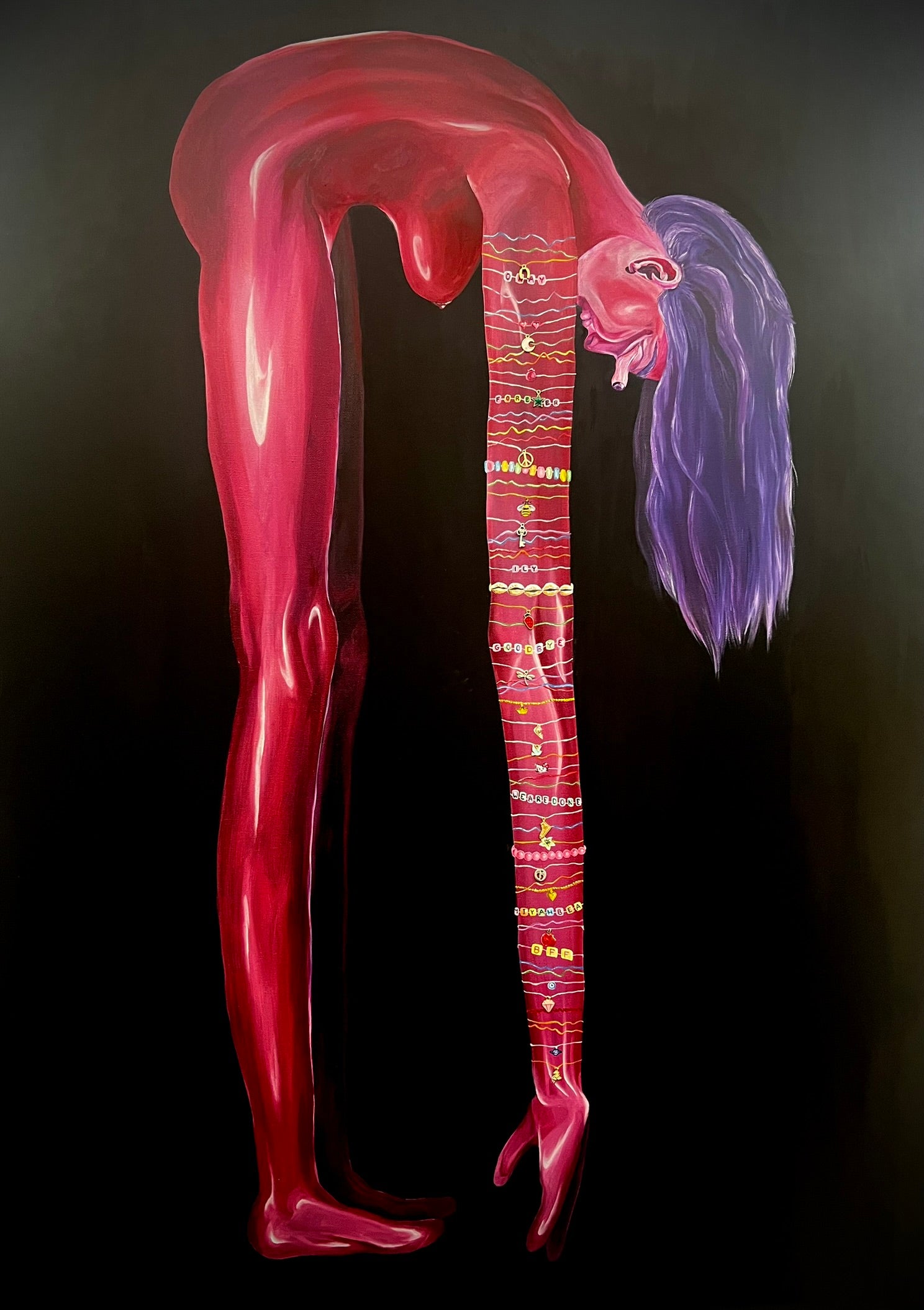 My piece Weighed Down is reflective of my artistic style. The work represents the struggle to move on from things that have happened in your past. The figure is being physically and metaphorically held down by different bracelets that were popular in my childhood, such as friendship beads, charms, silly bands, and candy bracelets. Each bracelet and charm is a specific reference to my past: lost friendships, family stories, impactful media, etc