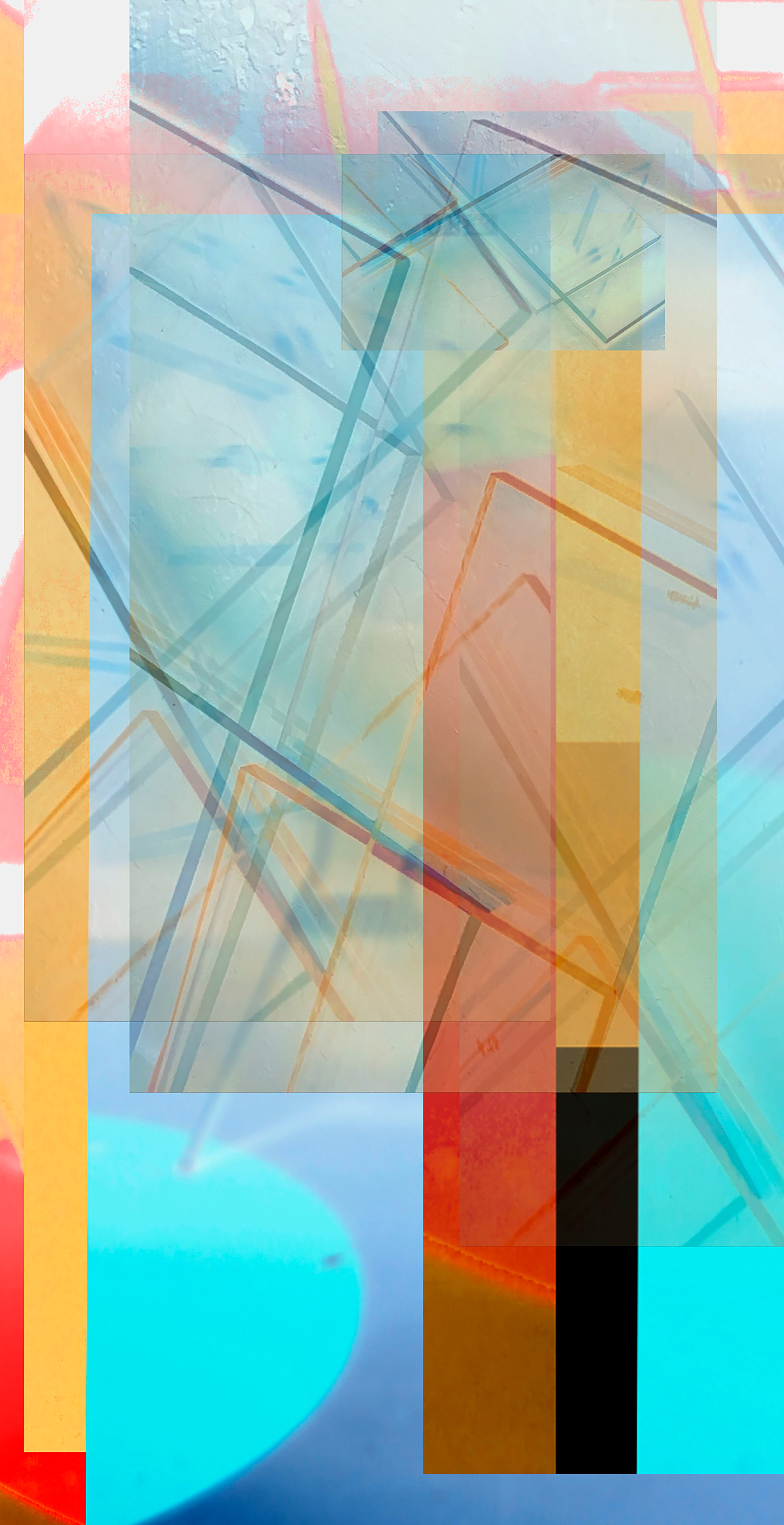 For myself, a composition such as this comes from an open-minded collaboration with my editing software. I stumbled upon these bold color forms by using the incorrect tool in photoshop. Fortunately, this is a digital experience, and I could go back to the previous work if I wanted to. Nevertheless, my interest in the photo expanded into a hunt for digital artifacts. All the colors and shapes have appeared from within the photograph itself. That is to say that the colors and forms are of the same data from the photograph, just with multiple filters placed over them. Like viewing the sun through just x-ray, radio, or gamma and getting different information from the same source data. What is left of the photograph are the textures of the wall and sharp angles of the acrylic sheets, which now stand as material alongside the splotches of visualized data provided by the software. Throughout the process I express myself and find levels of release through the creation of the work. As the work realizes itself, I feel more of a guide that brings it into existence.