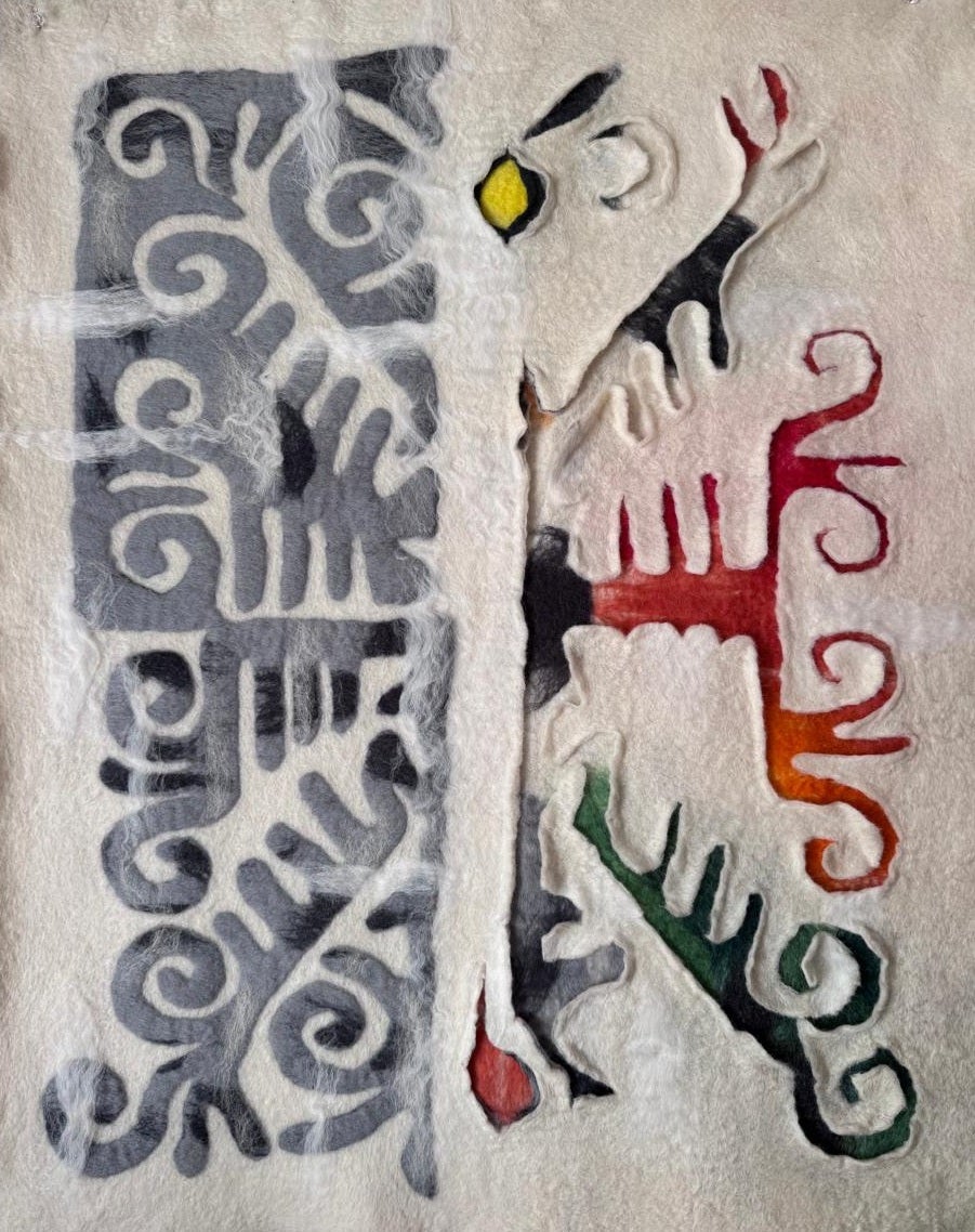 My primary medium is traditional Central Asian felting craft combined with stitching. Felting, the process of transforming raw wool fibers into a durable, non-woven textile, is a metaphor for my personal evolution. Just as fibers interlock to create strength, I use the symbolic language of traditional nomadic ornaments to communicate themes of protection, prosperity, and the balance between our historical roots and our flexible, changing present and future selves.
