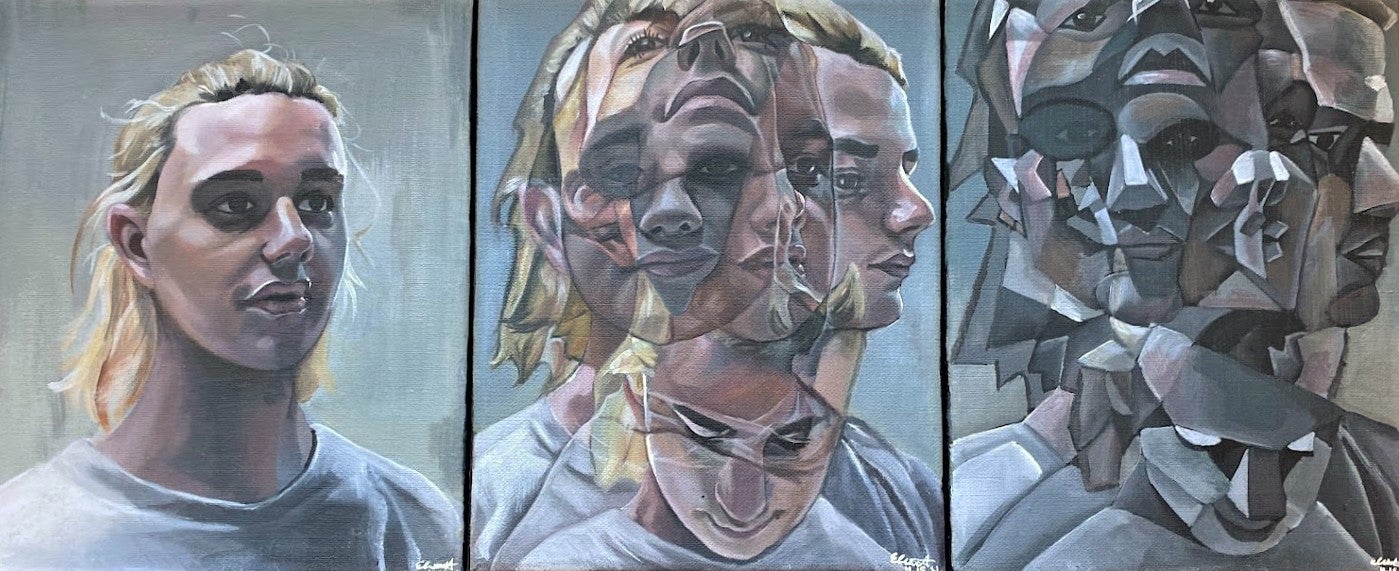 The creation of these portraits was to explore the concept of portraiture, and what makes a true portrait. In creating the piece, I looked at both cubism and more representational art before merging both ideas. In the middle portrait I used the idea of the face fragmenting into the many different views you think of when you think of the person, and the idea of conveying what it is you see in front of you from more realism and representationalism, and combined both ideas. The piece is overall a graduation from representationalism to abstraction.