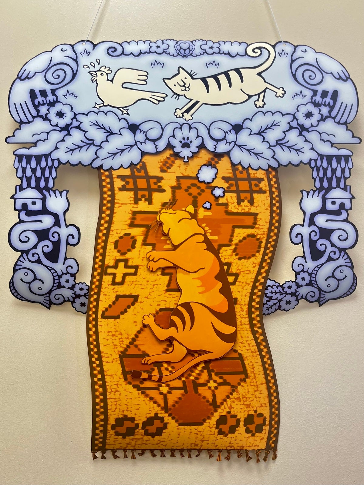 I wanted to create an art piece that peers into the titular housecat's mind and characterizes him as a dreamer and an optimist. I filled the borders of his mind with pictures that my own cat, Fitz, loves: watching the rain, chasing birds, and eating catnip, to name a few. To add to the pop-up book style, the rug is only attached to the frame at the top, which makes the art piece as a whole feel like it's floating on a dream. In Earthly Delights, for example, the rug and frame are two separate pieces overlapping, which is only understood by printing out and assembling the digital work. The physical separation of the frame and cat represents the disconnect between personification of domestic animals and reality.
