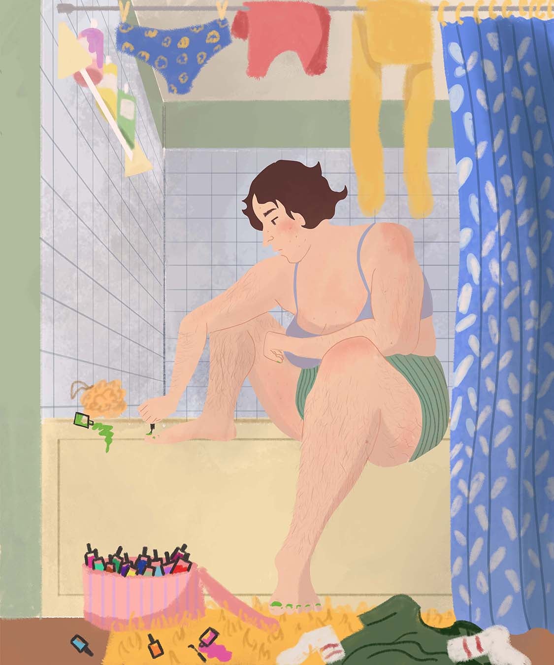 This idea further proves that even without the external validation of our friends and community, we as humans strive to perform and create- if only just for our bathroom mirror. Before COVID, femininity was the only gender expression I felt safe to present in public. While I sometimes wore masculine clothes, and began to grow out my leg hair, these acts were only small defiances to my overwhelming femme appearance. This performance was something I crafted from years of trying to mask my fatness and queerness under what was socially acceptable for my assigned gender. I believed If people already viewed me as lesser for my size and sexuality, I could earn their respect by becoming somewhat recognizable in femininity. However, the world’s shutdown in 2020 shifted this mindset. Baggy shirts and cargo pants became my everyday appearance while my femininity became a performance to explore as a costume, rather than a reflection of myself. I let go of trying to be palatable for the male gaze and instead dressed however I felt comfortable. This allowed me to realize my gender identity reflects that of a drag queen rather than a cis woman. This truth led to my realization of my trans identity. I now find androgynous clothing and using They/Them pronouns feels more authentic to my inner self than the costume of femininity I wore throughout my young life. While I still sometimes explore elaborate presentations of femininity, this performance is one I can take off. The ability to privately explore my gender allowed me to reinvent myself. My piece reflects the power of private spaces, specifically, my experience of transformation during the pandemic.