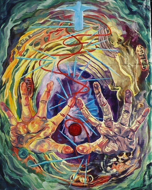 The work on display is titled "Palms of Ichor," an acrylic painting depicting the essence of life. It is part of a series of works that transfigure the physical, academic, and scientific into spiritual and religious narratives - "ALCHEMA." The common theme and "grounding" imagery are the human body, or hands in this case; here, they form the Trimurti Mudra (symbolic Hindu and Buddhist hand gesturing). This yoga Mudra represents creation. In the center is a ribosome, a cellular organelle responsible for translating messenger RNA (mRNA) into proteins in gene expression. This scientific process fuels all biological machinations, which I inlaid as a new symbol for life within the Mudra and the Illuminati (the circular ribosome within the triangle formed by the index and thumb fingers). The second inlay of the Illuminati represents the omnipotency of life's essence rather than that of God, or any god. Emerging from the red ribosome is an unraveled DNA helix made to look like threads, symbolizing the interconnectedness of people. The background is a recreation of a detailed animal/human cell diagram, one of my reference photos, and inspiration for the color palette. By combining and reinventing symbols, anyone regardless of faith or identity can find something symbolic that resonates with them. I encourage you to have your own interpretation.