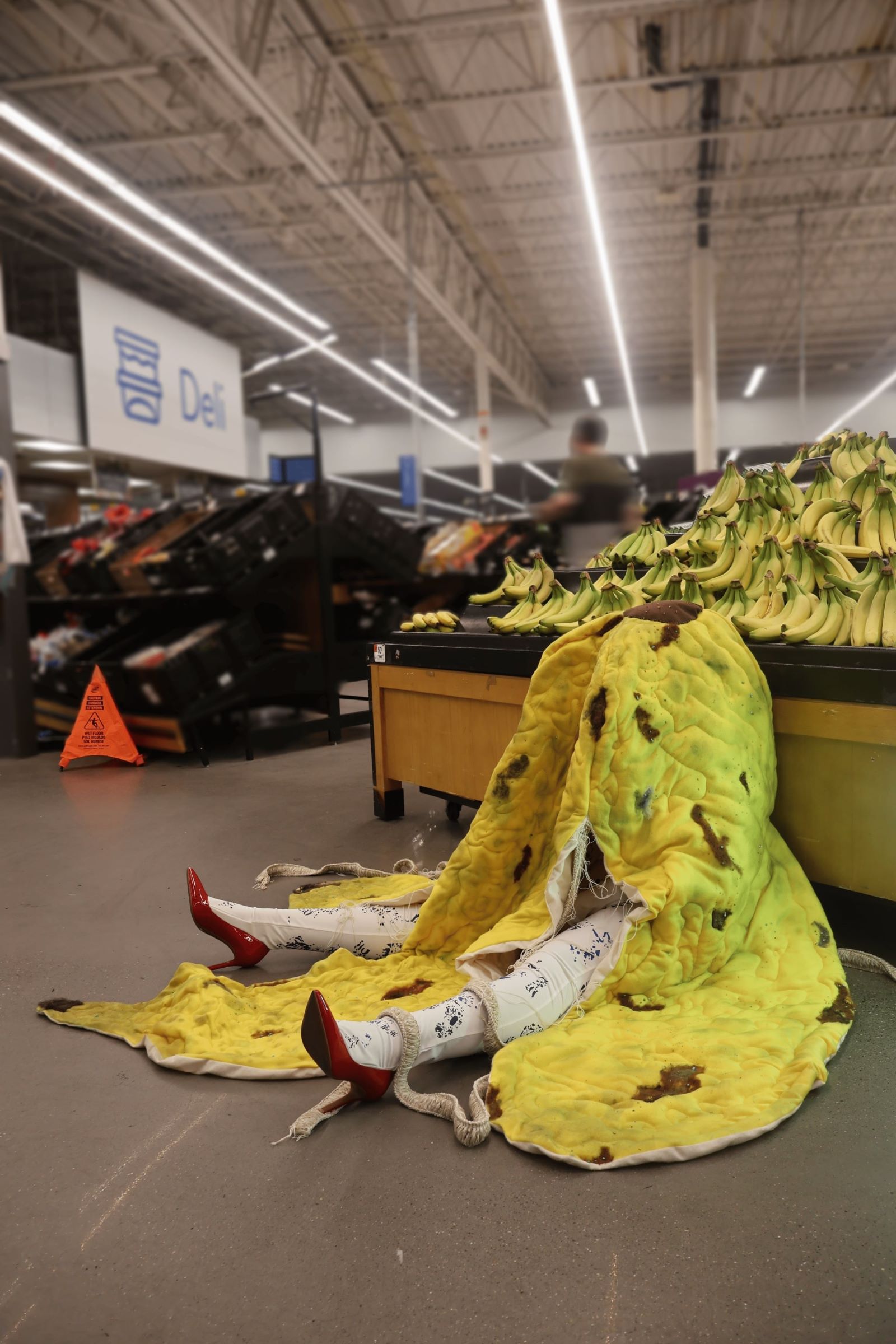 I use a combination of textiles and ceramics for these pieces for a multitude of reasons, including the juxtaposition of the soft and approachable fabric banana and the solid rigidity of the ceramic frogs. The frog shapes are hand built out of porcelain clay and arranged into mass swarms or colonies, which has an amplifying effect on their presence and ability to hold space. Their coloration is inspired by the history of countless workers stained blue by the Bordeaux Mix pesticide used on plantations, and the bananas are a symbol of a past empire gone to rot and being reclaimed by the land and people it used to rule. My primary mediums of choice have become print, ceramics, and textiles, each of them holding significance in my practice as very process-based mediums. The process of using my hands to create adds a level of personal involvement reminding viewers of the invisible hand.