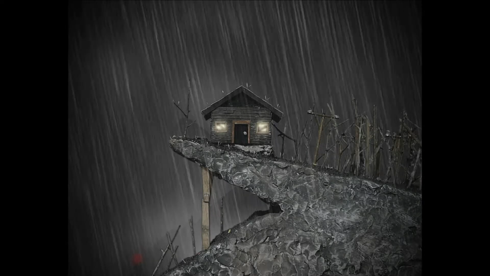 This creation is a mix of 2D digital art and a clay miniature model. The mountain is made of clay that has been painted over with acrylic, the cabin is balsa wood and paper carefully–and painfully–hot glued together, and the trees are broken twigs stuck into the clay and lightly spray painted. The background is a simple drawing, the rain overlay is just simple blue streaks.