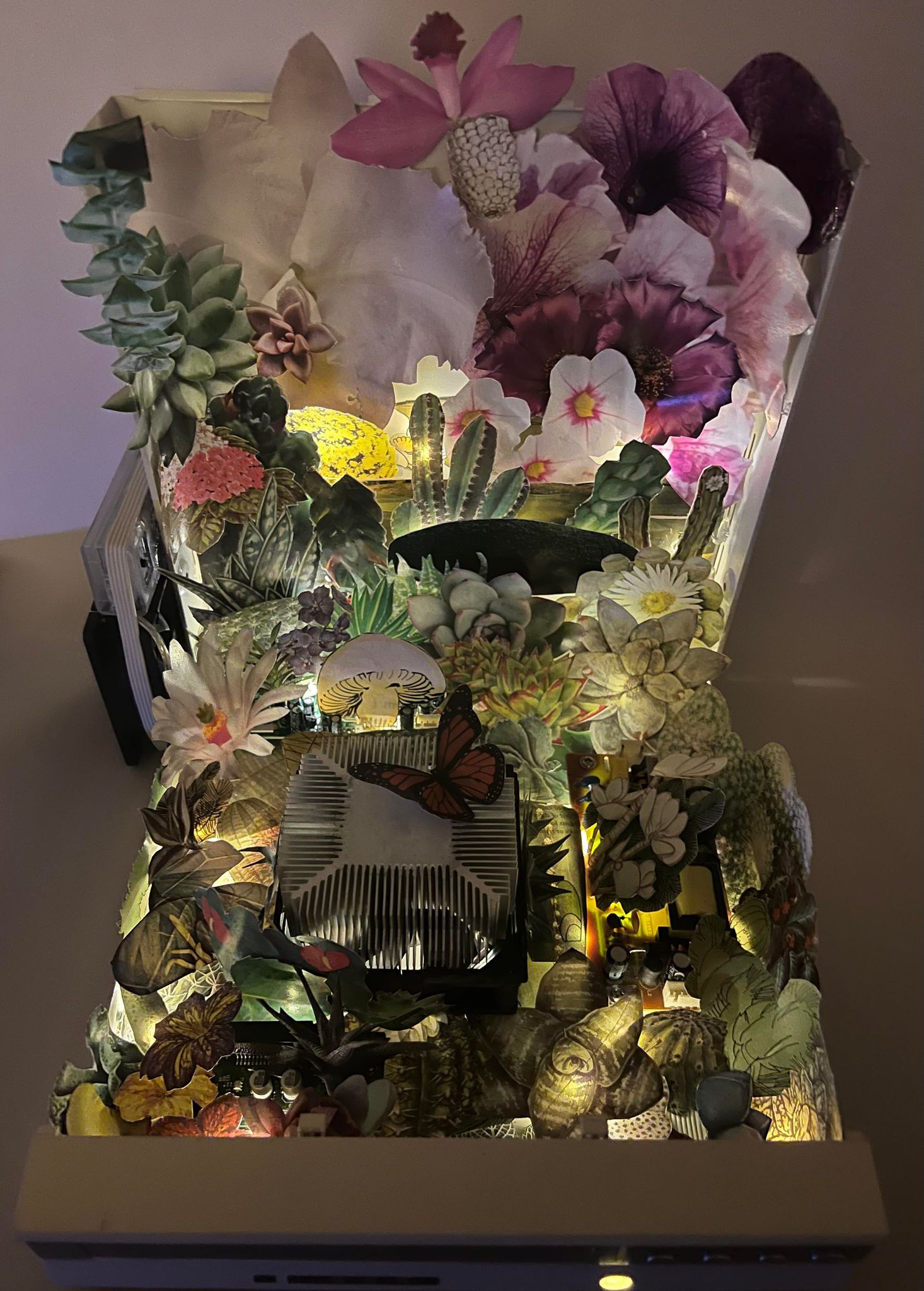 The city of insomnia. When we imagine the power of nature capable of engulfing modern technology even after a long time, nature will eventually survive. I started learning about collage-making. Hence the idea that if collage is three-dimensional? What is the format of the installation? I thought that college would be more interesting when it came to dimensional form. It is a rough idea that made this work. Then, I saw technology that was abandoned, old, or not used at all. I start collecting some of the old parts machines, old electric appliances. I have been thinking of using most of the waste of equipment. Plants, flowers, all sorts of plants were housed in an old-fashioned DVD player box. and a circuit board structure that assembled like a small town covered with greenery. It is a conflict between the creator's nature and the technology created. The difference is extreme, but it is back and forth with each other. The twinkling lights are like the vibrancy of the trees that make the city colorful. This work brings me closer to nature, it relaxes my eye every time. I feel like I am about to take a walk in the middle of the garden. Of course, when there are flowers, plants have life. The butterfly, who acts as a pollinator, chooses to cling to the building-like iron. They are attracted to the lights of the city just like us. I believe that no matter where we are, nature will give us some peace of mind.