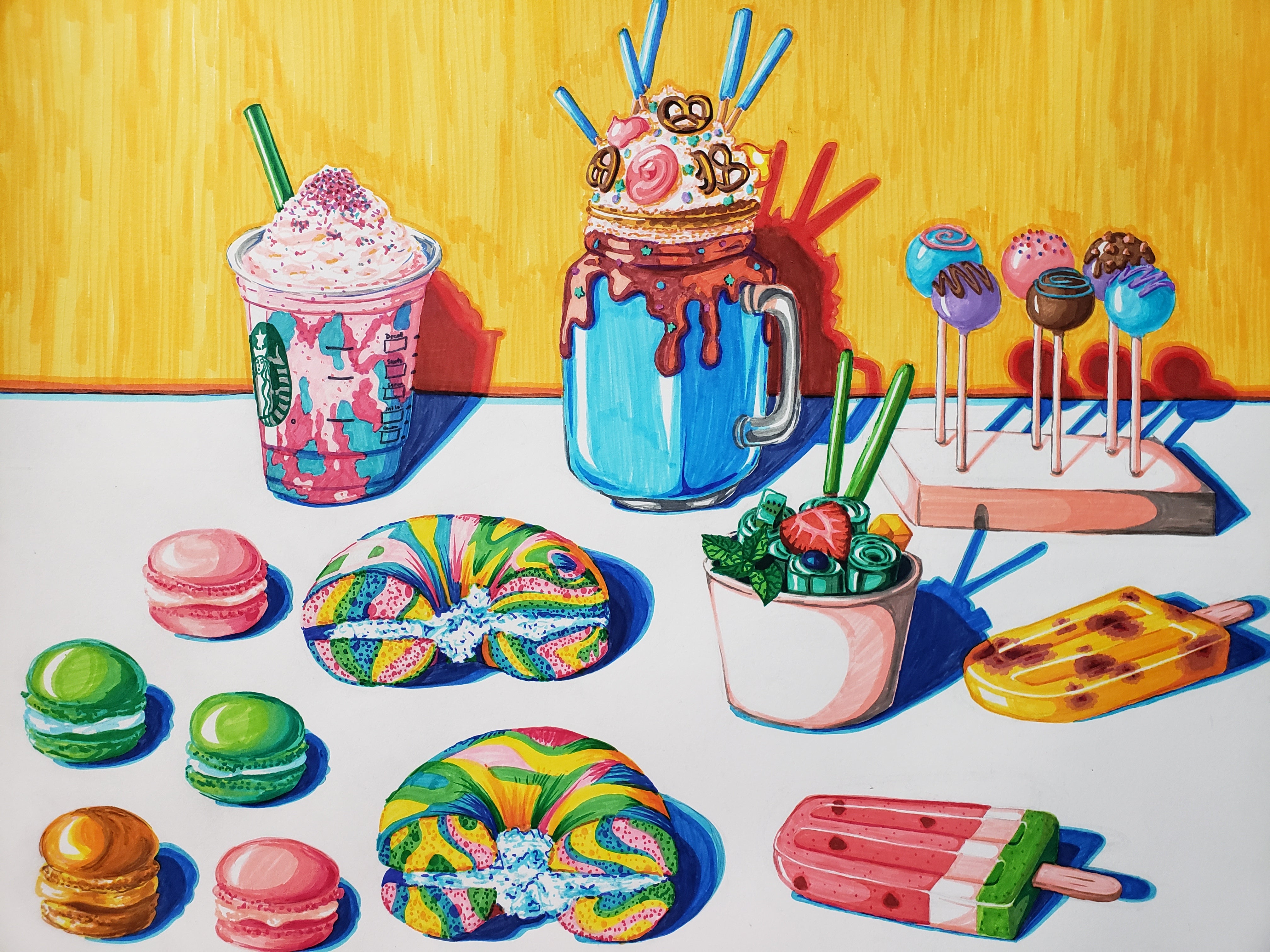 In this piece, I explored the types of novelty sweets that have gone viral in today's world and depicted them in a way like that of famous painter Wayne Thiebaud. I wanted to tie in the elements of both consumerism and playfulness, Pop and Contemporary Art, to create something that translates the way our ever-changing society views novelty. A sort of homage to Thiebaud, I implemented exaggerated color and high contrast of appealing foods, much like the oil paintings he created of cakes and other items.