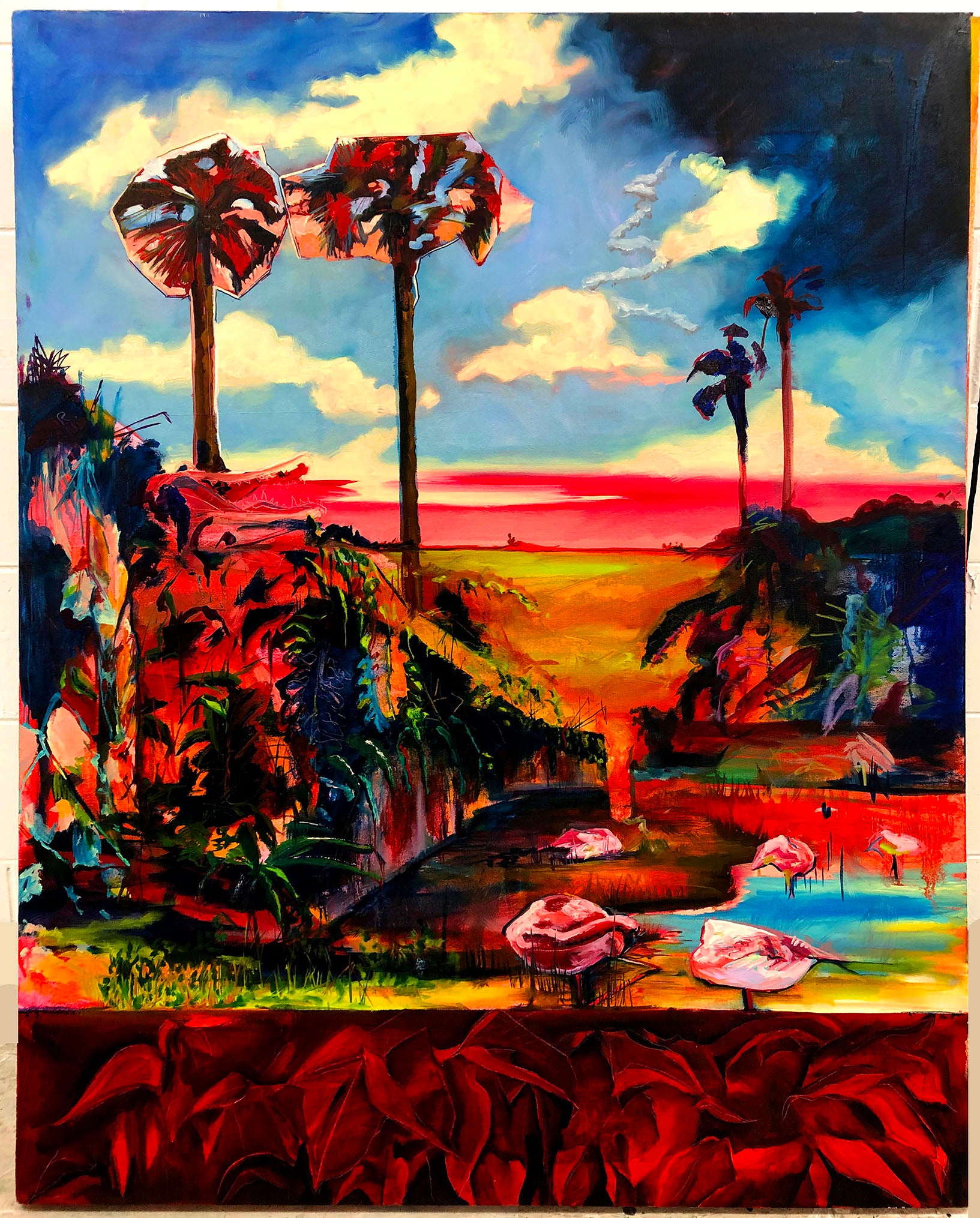 Saturated landscape with hidden flora and fauna. Growing up in central Florida’s swiftly changing landscape largely inspired my current body of work. Changes in natural and urban scenery create a sense of whiplash in one of the fastest developing parts of the country. I have always been attracted to the flora, fauna and history of eco-tourism. When creating my work, I look to old roadside attractions such as Gatorland and local springs where the line of what is constructed and what is natural are deliberately blurred but still definable. I use paint to construct saturated memories of these places. Using a collection of cut paper, mid-century ephemera and personal photographs, I collage these ideas and images together when making a piece. Painting allows me to develop specific ideas on canvas as I go, letting the work take on a life of its own, blurring my own line of what I’m constructing and how the paint reacts to it naturally. The effects of this process show a dichotomy of an Eden like Florida dream with a sense of ecological doom. As I paint these scenes I consider how the design affects the meaning of the work. Elements like high key colors overwhelm the canvas while subtle lines throughout allude to the cut out nature of the papers I work from.