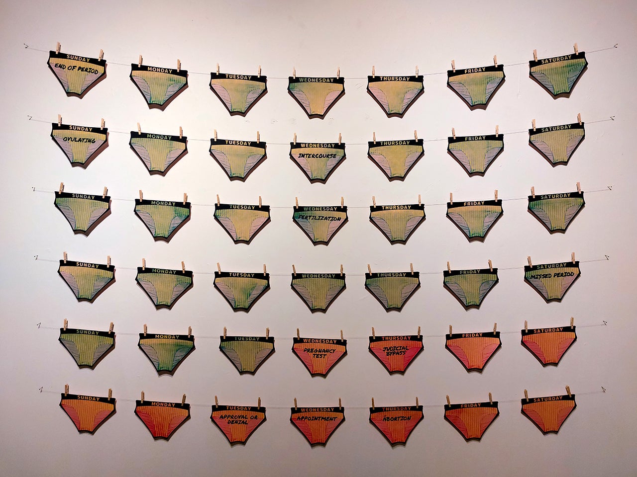 6 Weeks/11 Days responds to the 6-week abortion ban currently in place in Florida. It consists of six lines of weekly underwear, forming a calendar from gestation to abortion appointment, highlighting the limited time available to an impregnated individual. The work features an underwear motif, highlighting the personal nature of the rights being legislated and the invasiveness of the attempted control.