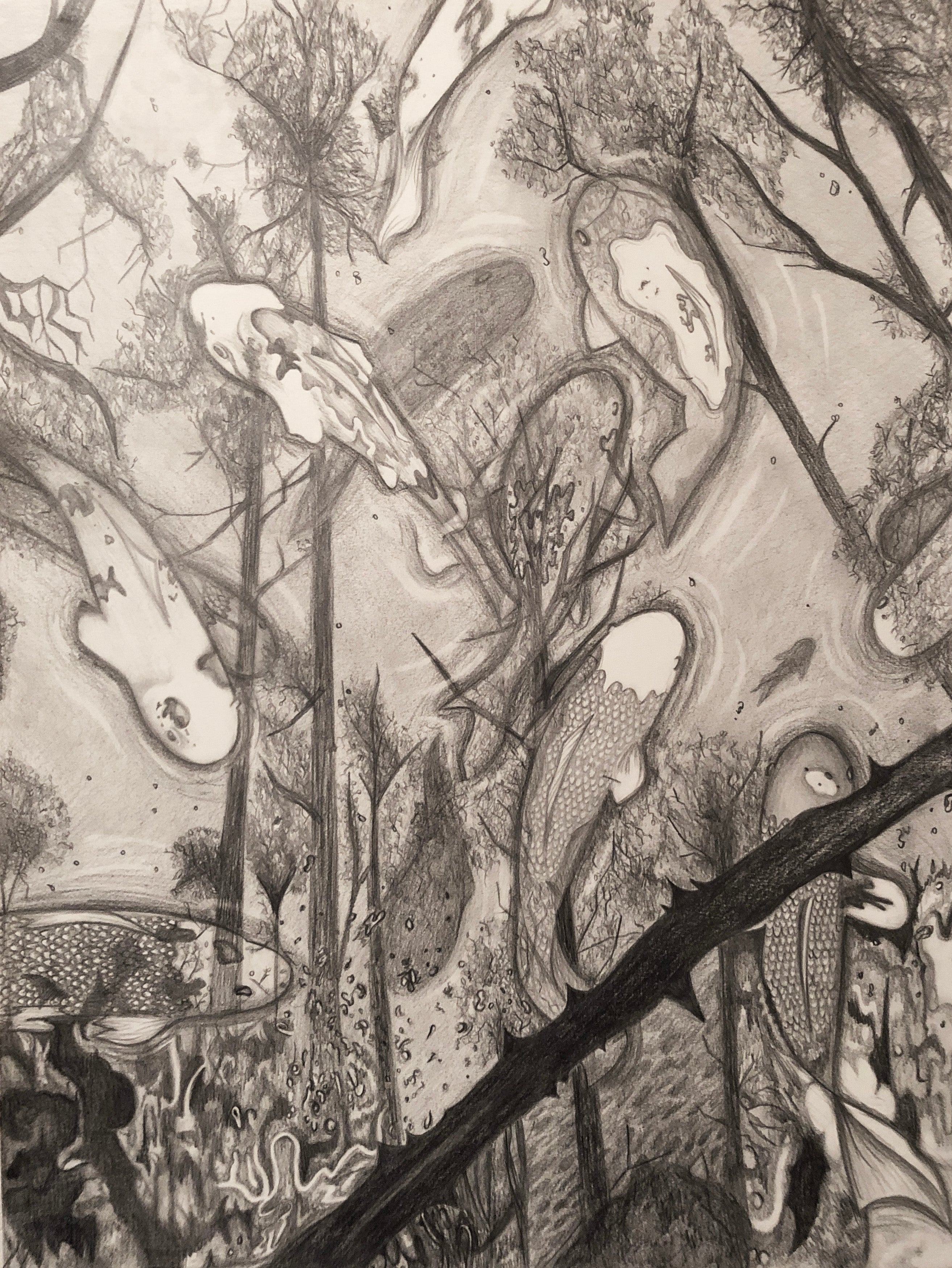 I created this graphite drawing in my Drawing Foundations class in Fall 2018. It was the final project we were working on. The topic was to develop a collage of cohesive images that meant something personal and to transfer it onto paper through graphite or charcoal. What came to me first was that I wanted to create a koi fish art piece. I had always loved portraying koi fish since early high school. Whether it was through senseless doodling or through serious creation, I had always drawn them. My Koi Piece was also created using most of my own images. I had dived deep into my past photographs and the only part of my drawing that was not derived from me is a few of the koi fish.