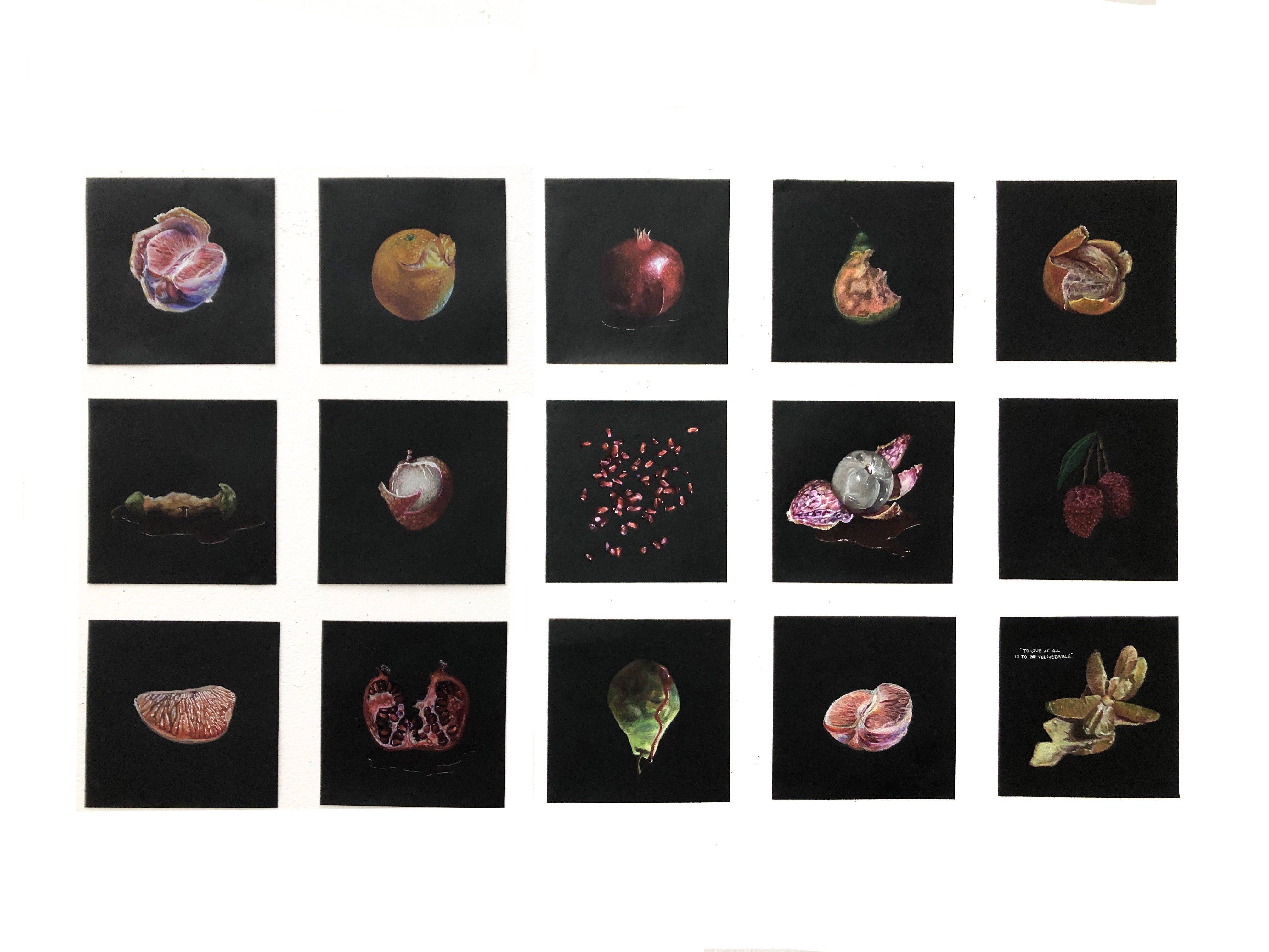 Her current art practice is focused on exploring vulnerability, using fruit as a metaphor. Similar to how you peel back layers of fruit, you peel yourself open little by little until you trust the other person in the relationship. But even when there is trust, there is always the possibility that they can hurt you and break your heart as easily as breaking the thin membrane covering an orange slice. And this is the risk of love and friendship but vulnerability is essential to these; you cannot have strong relationships without it. She wants to demonstrate through her work that being vulnerable with another person is as beautiful as it is scary.