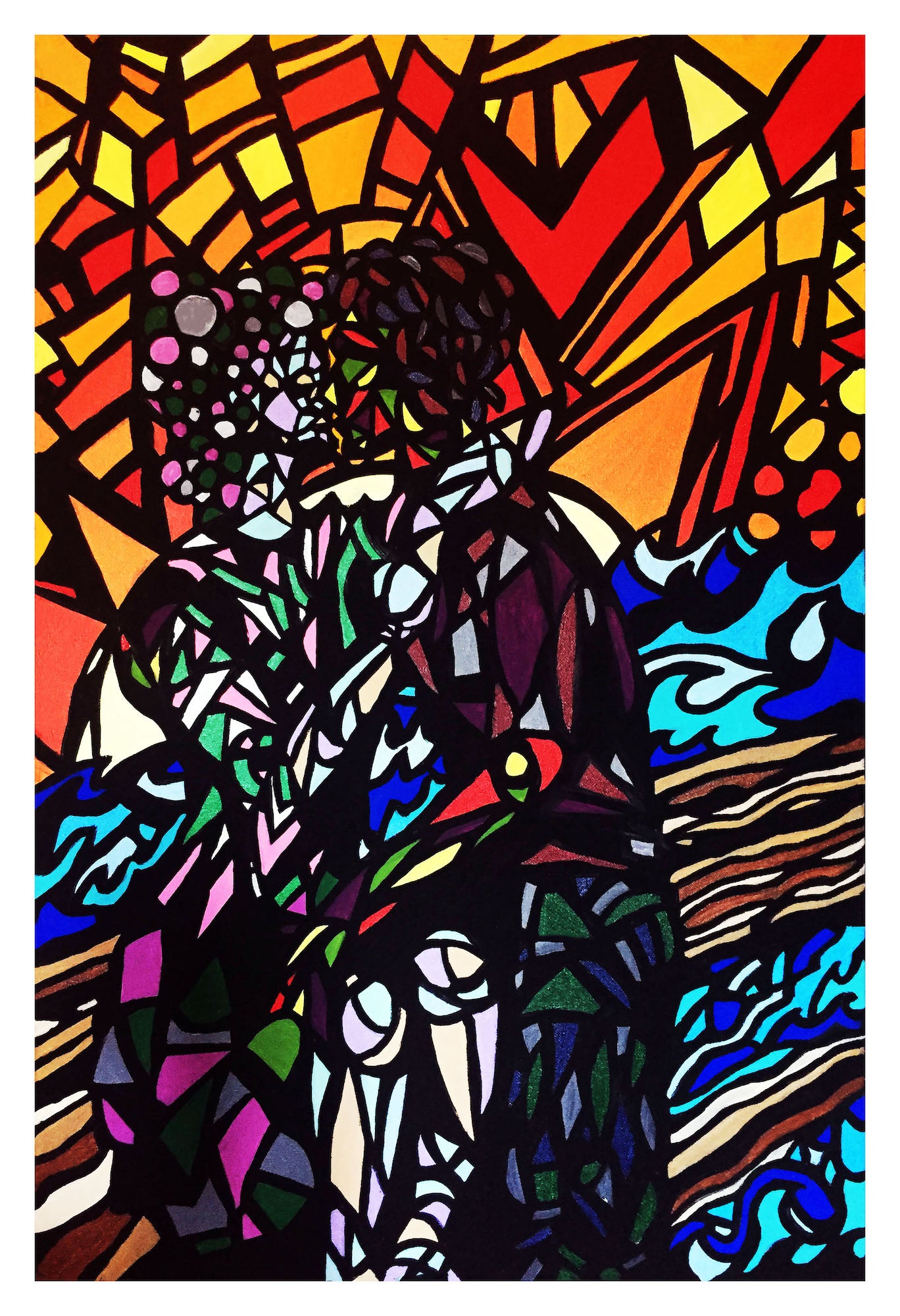 My piece, “Mosaic Lovers,” uses saturated colors and bold lines to create a stained glass or mosaic feel. The work depicts two figures embracing each other during sunset. For this piece, I wanted to create a feeling of harmony and balance by using complementary colors for the two main colors: with orange taking up the top half of the painting and blue with the bottom half.