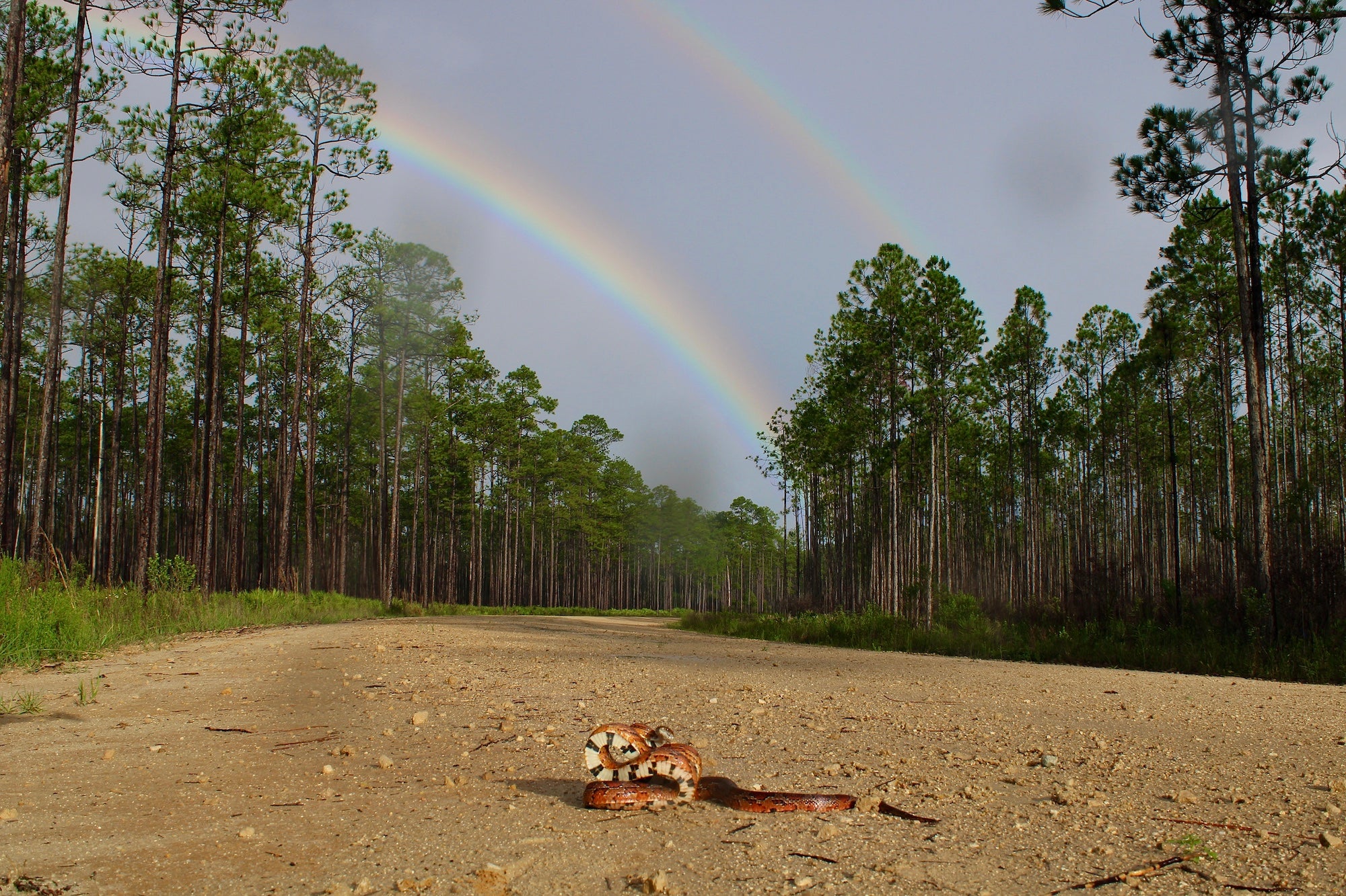 During the height of the pandemic, I found myself in the national forest often. One day, I was road cruising—this is what herpetologist call it when you drive up and down a road looking for snakes basking on the warm road—and a sun shower had just begun. I drove up on a beautiful corn snake with its characteristic black and white checkered belly soaking up the June sun. Weary of me, she assumed her defensive posture: head high and body coiled beneath. As I started to photograph her, I noticed a rainbow forming in the background—beautiful! It wasn't until I got home that I realized I had captured a double rainbow!