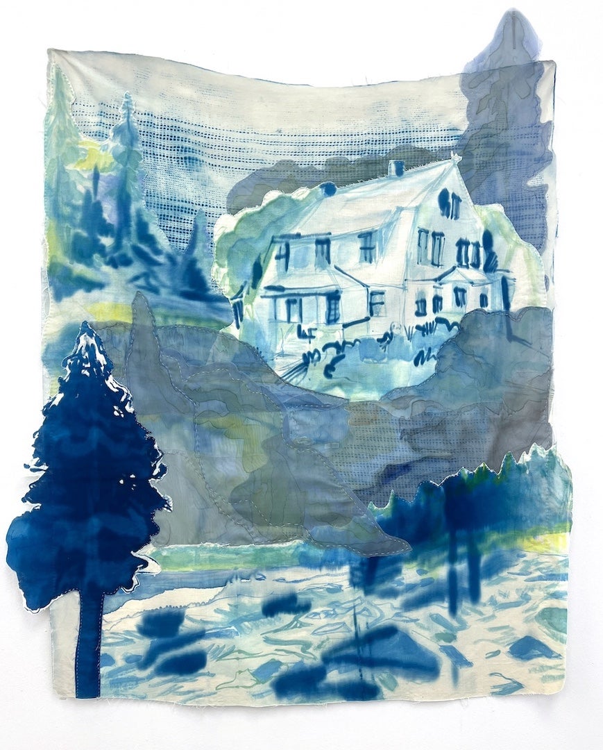 By creating paintings using alternative photographic processes, historic quilt patterns, and secondhand Maine textiles, I create a dialogue between women’s history, craft tradition, and contemporary storytelling. Each painting uses a combination of watercolor, ink, gouache, and cyanotype. The cyanotype is often used as paint, applied alongside the paints and then imprinted with photograms of familial objects or digital negatives of archival or personal images. Once dry, I develop it in water, which in turn washes away part of the painting itself. This process both reveals and destroys, a notion that references the delicate nature of memory and archive. Maternal histories and knowledge are difficult to find in archival materials, and when they are found, they are commonly recorded by men. Much of this history is an oral one, passed down between generations but forgotten over time. This practice restores some of these histories by weaving together a new narrative of Maine history.
