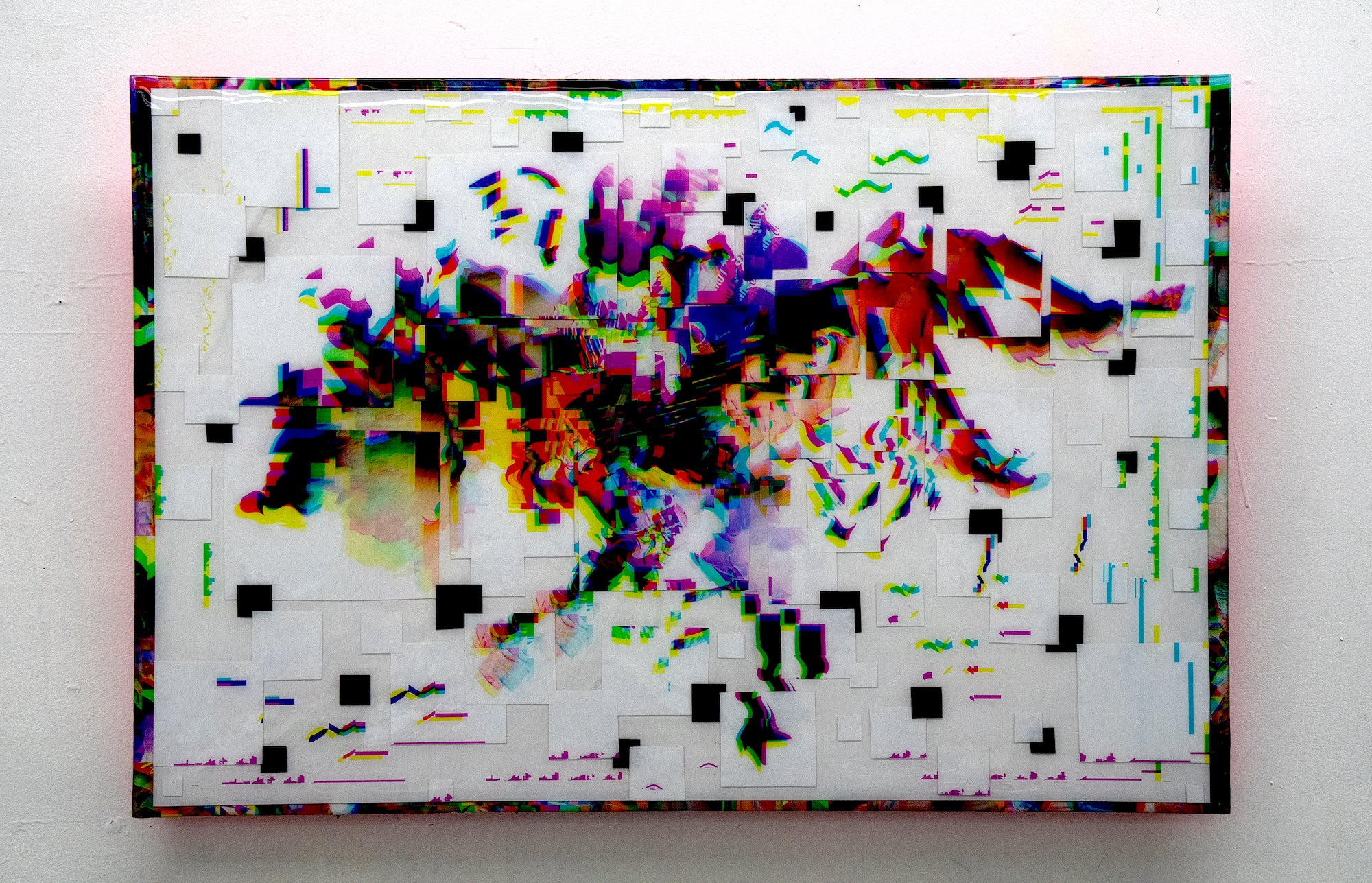By constructing a collaged board that acts as the skeleton for the pieces, one can take cheap materials and slowly evolve into a hyperglossed product that is beautiful but brittle, strong yet fragile from the right force. Resin is used to bind as much as it is to separate through matter the various layers of the piece, harkening to the construction of one’s identity. After an initial art object collage is made through the selection and incision of commercial and socially driven images and subsequent decision to place them, I then scan and digitally manipulate a glitch into the piece. This becomes a journey from a constructed image, to an AFK collage, to a digitized glitch that has evolved in the fourth dimension away from the confines of the expected.