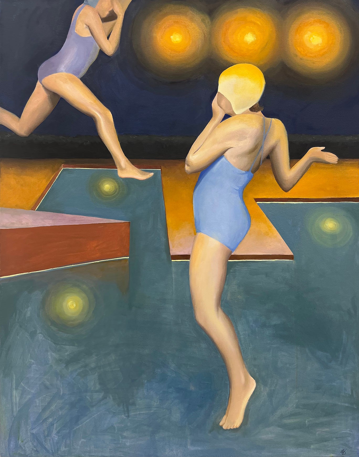 The settings in my work can feature recurring symbols, such as pools. In the painting entitled Sundogs, the pool acts as a domestic portal, creating a gateway to an unstirred, uncanny, and surreal suburbia for viewers. Sundogs features altered figures from old family film. They jump into a strange, imagined pool, representing the area in between the unconscious and conscious mind; a liminal and dream-like area. The atmosphere is still despite the figure's motion. The divers jump into the water from above and although there are three suns, it is still dark.