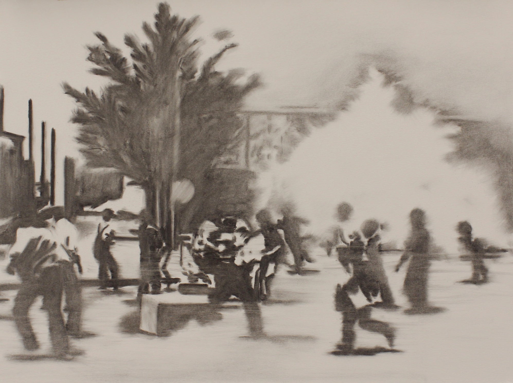 My recent drawings finished with charcoal and pen on paper express the provisionality of memory, since charcoal is a material consisting of volatile chemicals and ash. In addition, sophisticated pen strokes indicate the characteristics of flawed and fragmented memory. The drawing represents my memory and its impression because when I try to remember the memory or images that I’ve seen and learned from secondary sources in terms of the social movement, that is always very blurry and hazy, like a picture out of focus. My memory is vulnerable and flawed because it is the recollection from the past, and subjective feelings and emotions are involved. At the same time, the achromatic drawing implies that when I experienced the movement through the documentary, I was sitting on a dark chair in a dark classroom because the curtains were closed for the documentary.